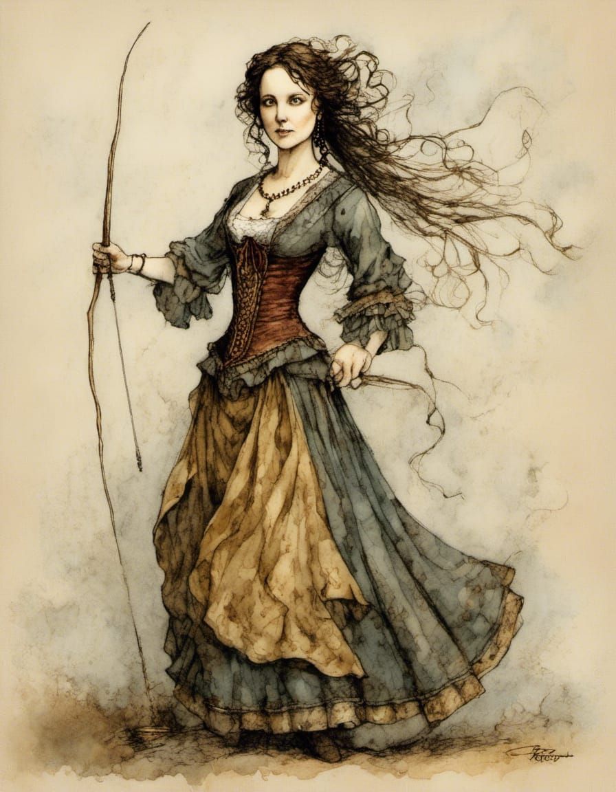 A vibrant watercolor and ink illustration of a gypsy woman standing in the wind, holding a magic wand. This image captures the art brut style with bold, vibrant colors and sharp lines.