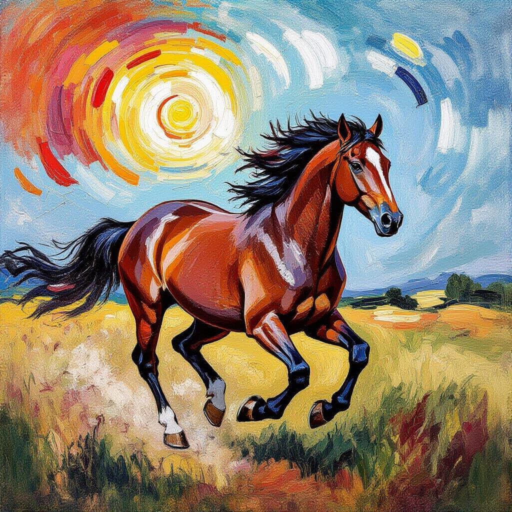 A vibrant image of a horse in motion with blurred legs and flowing mane. This dynamic painting uses impasto techniques and clashing colors to create visual tension.