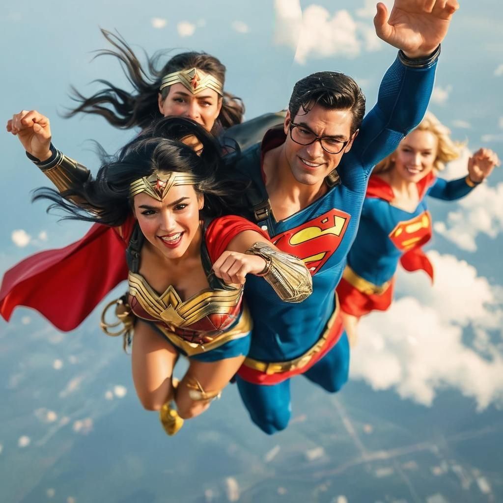 This image shows three friends in superhero costumes skydiving. The artwork is hyperrealistic and intricately detailed with a dramatic color depth. The friends are dressed as Wonder Woman, Superman, and Supergirl.