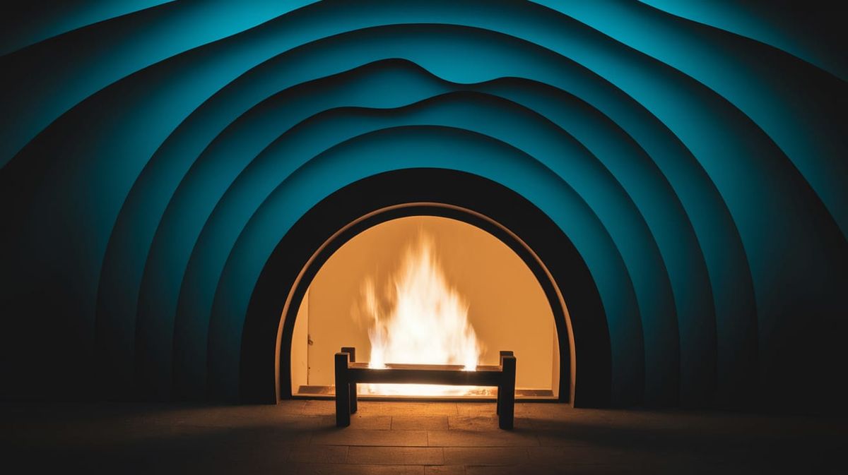 This image is a captivating abstract depiction of a fireplace at night, characterized by a soothing dark teal background and a warm, inviting orange glow. The enigmatic scene is rendered in a minimalist style, evoking a sense of mystery and allure.