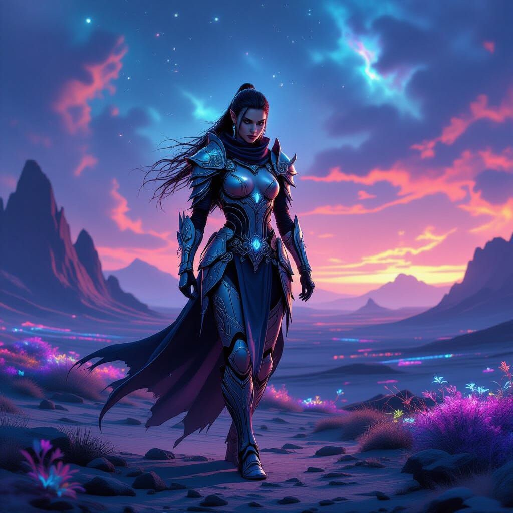 This image shows a lone warrior in advanced armor blending elven and cybernetic styles on a vibrant alien world. Bioluminescent plants and colorful nebulae create a dramatic, glowing atmosphere.