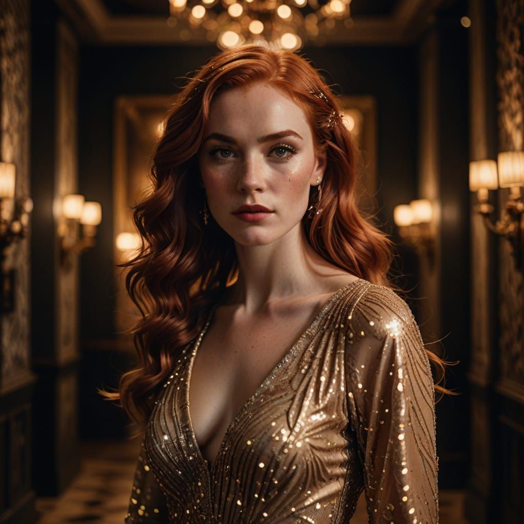 This cinematic portrait features a stunning woman with fair skin and vibrant red hair, dressed in a glittering gold evening gown, set against a dimly lit backdrop with soft, golden lighting and deep shadows.
