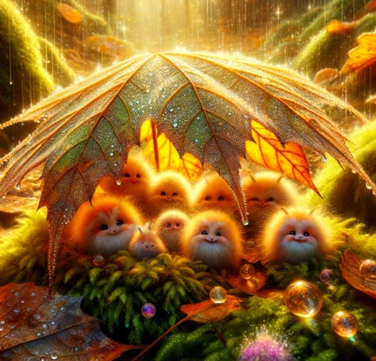 This enchanting image shows tiny, adorable creatures peeking out from beneath a shimmering autumn leaf, surrounded by ethereal mist and delicate fairies in a mystical, whimsical woodland scene reminiscent of 19th-century fairy tale illustrations.