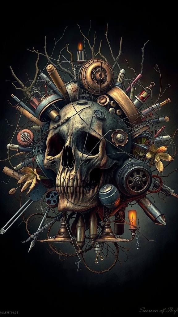 A striking picture of a skull intertwined with machinery and vines, illuminated by candlelight in a dark setting. The image evokes dark surrealism with hyper-realistic detail, and gritty textures.