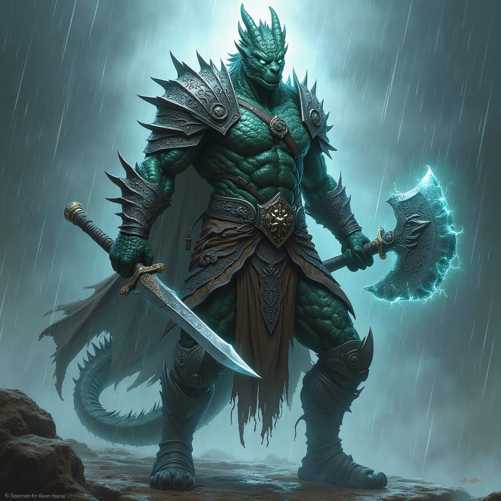 A dragonborn warrior stands in a storm with a battleaxe and sword. The character is armored and illuminated by lightning, with dramatic lighting and hyperdetailed textures in an art nouveau style.
