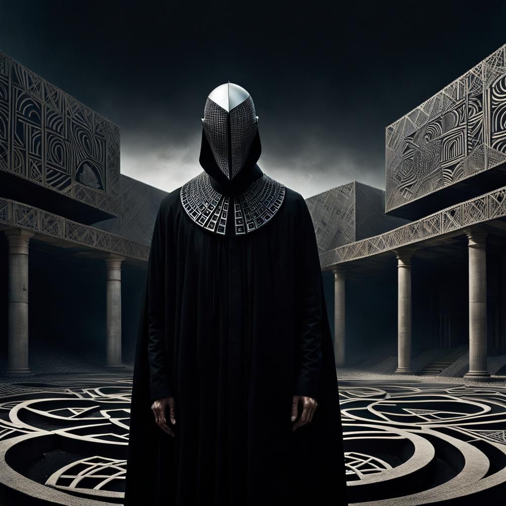 A surreal, ultra-realistic landscape of a decaying world, where a faceless figure stands at the edge, surrounded by ethereal alphabets and vibrant colors against the dark void.