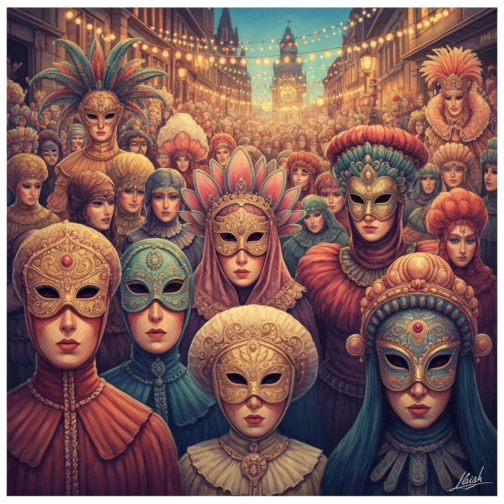 This image captures a lively festival with people in elaborate masks and colorful attire, set against a backdrop of festive lights and decorations, rendered in a whimsical and fantastical illustrative style.