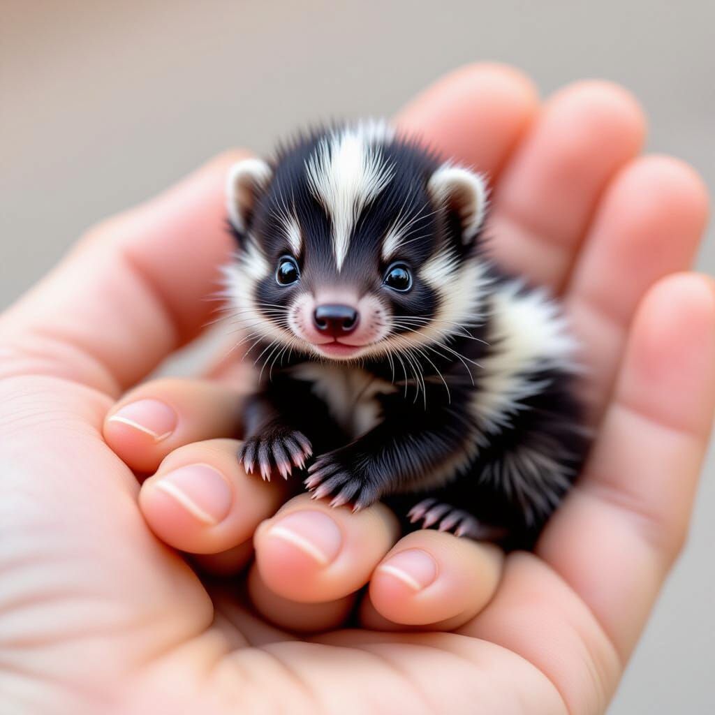 This macro photograph captures an incredibly cute baby skunk nestled safely in a human palm. The image focuses on the tiny creature's endearing details.