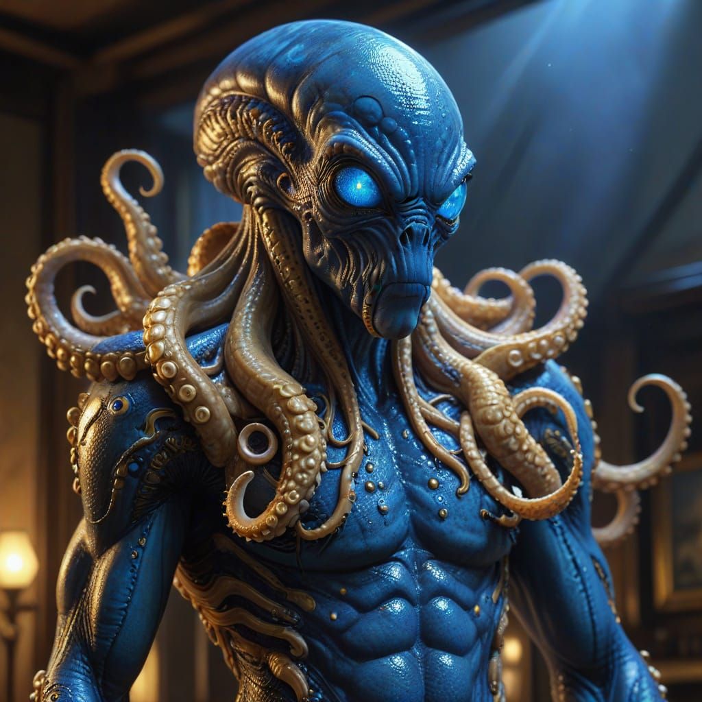 A striking picture of an octopus-like alien posing with hand on hip. The portrait features glowing blue eyes, tentacle-like hair, and warm golden lighting, as a dramatic fantasy oil painting.