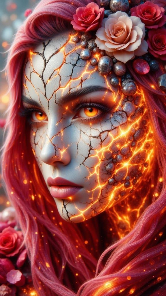 This striking portrait features an Aztec goddess with intricate gothic and leopard-inspired face paint, glowing skin, and iridescent details. Presented in a hyper-realistic, 5D pop-up style.