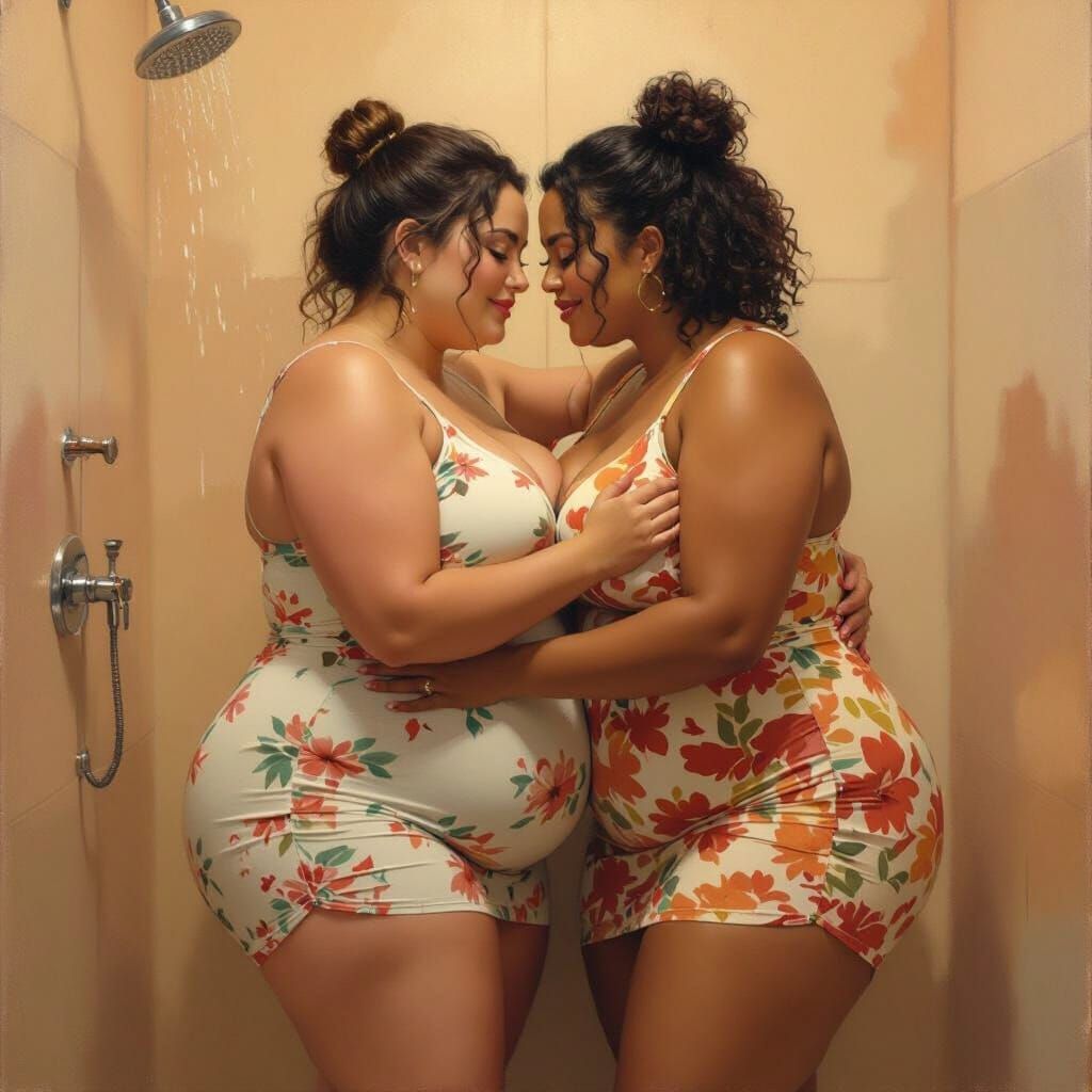 This image shows two plus-sized women embracing under a shower. The soft, warm lighting and earthy colors evoke a sense of intimacy, reminiscent of portraiture using expressive brushstrokes.