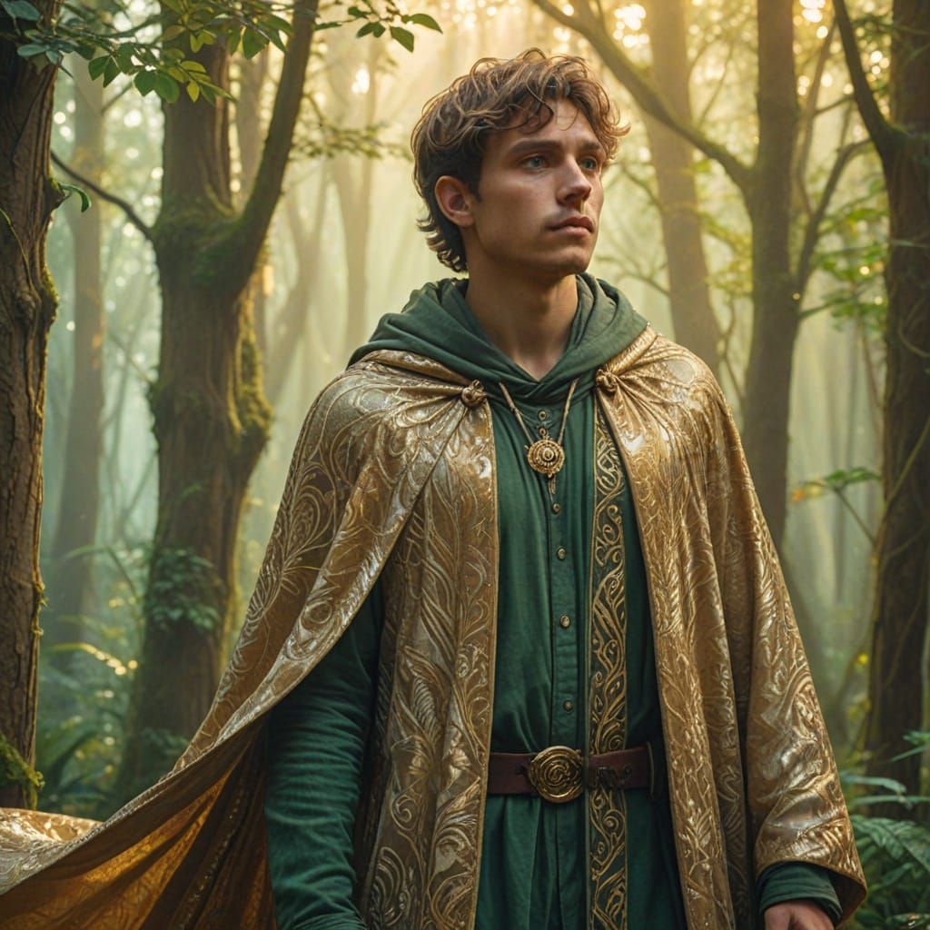 A medium shot shows a young man in a mystical forest. Golden light illuminates his cloak. The image features shimmering auras and a misty atmosphere as concept art inspired by Alphonse Mucha.