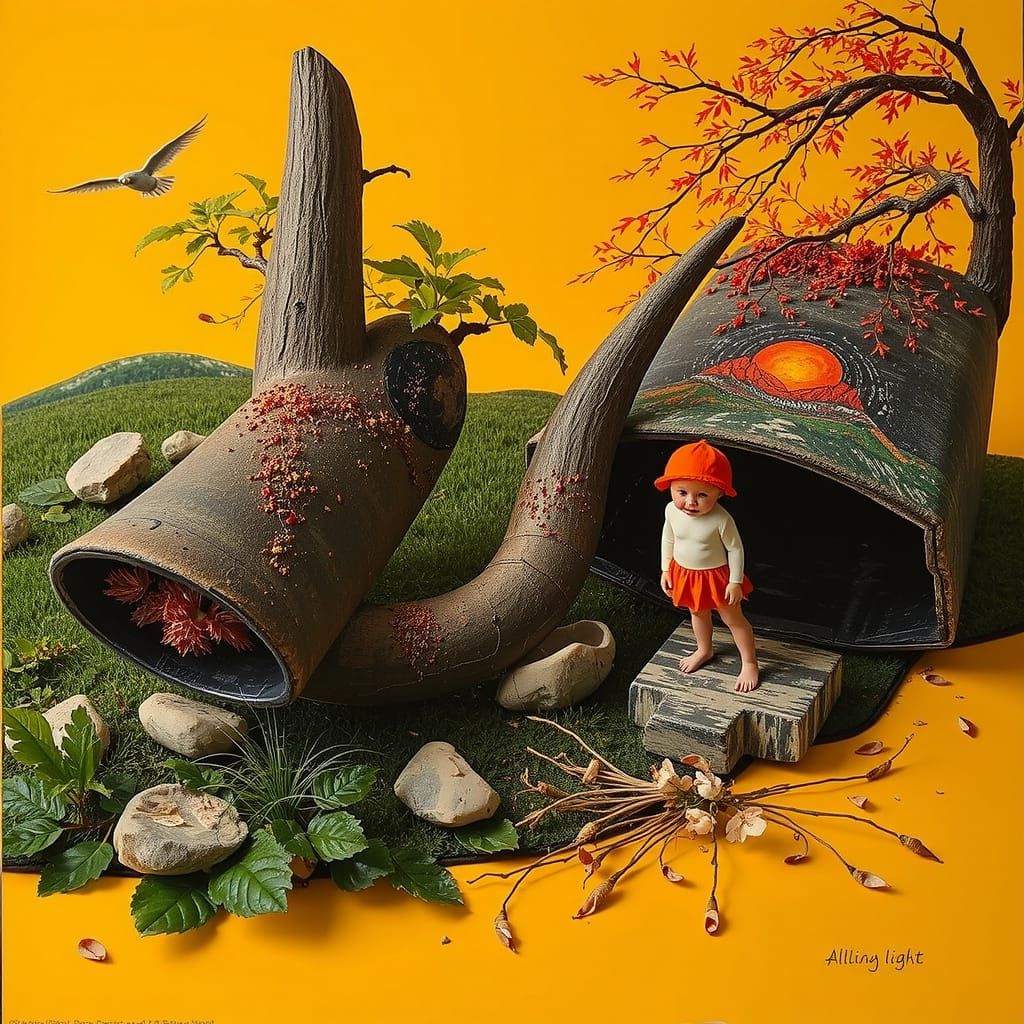 This image shows a surreal landscape blending vibrant colors. Blue sky meets green fields and red lands, while golden leaves and pink skin tones add to the abstract composition.