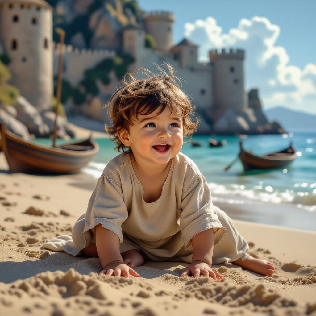 A realistic image of a baby boy playing on a beach in 15th century Italy. Medieval boats and stone fortresses surround the scene, rendered with intricate textures and dramatic chiaroscuro lighting in a dark, fantastical style.