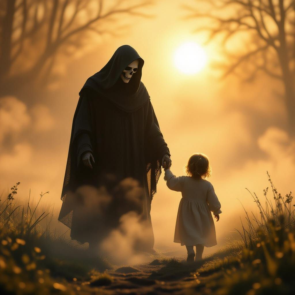 This image shows the Grim Reaper gently holding a child's hand, walking through glowing fog towards a light. It conveys warmth and sorrow with photorealistic detail and soft golden tones.