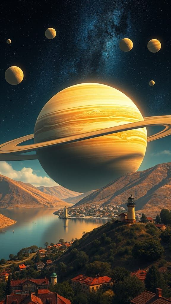 This image shows a serene landscape with a massive ringed planet rising above the horizon, surrounded by a peaceful village, a lake, and a solitary lighthouse, under a warm and mystical sky with soft, golden clouds and a sense of depth and wonder, created in a surreal and dreamlike style with intricate d...