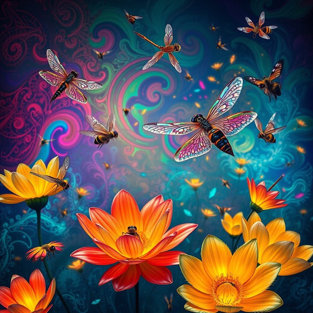 This vibrant image shows a swarm of glowing dragonflies and bumblebees surrounding a tapestry of exotic, neon flowers, set against a backdrop of swirling, psychedelic patterns in a surreal, fantastical dreamscape.
