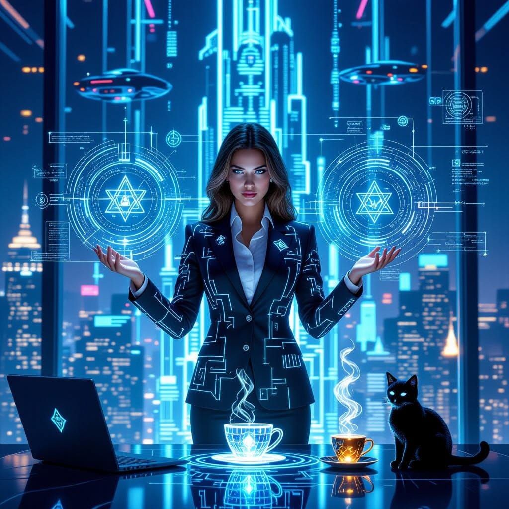 This image depicts a futuristic corporate witch in a neon-lit skyscraper office, surrounded by holographic elements. The scene blends cyberpunk aesthetics with modern witchcraft, featuring vibrant blues and silvers.