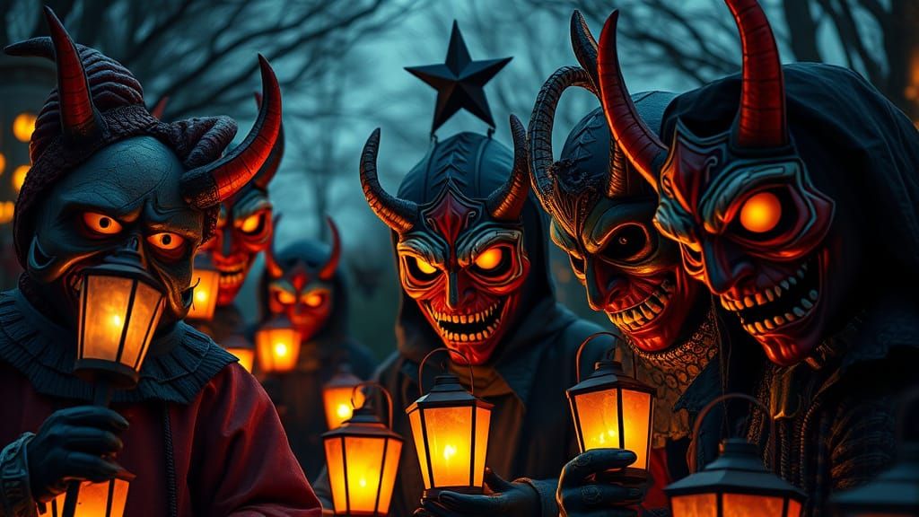 A fall festival parade celebrates Candlelight Eve with characters in demonic masks and ornate costumes, holding lanterns. The scene blends eerie and festive elements with detailed, weathered masks.