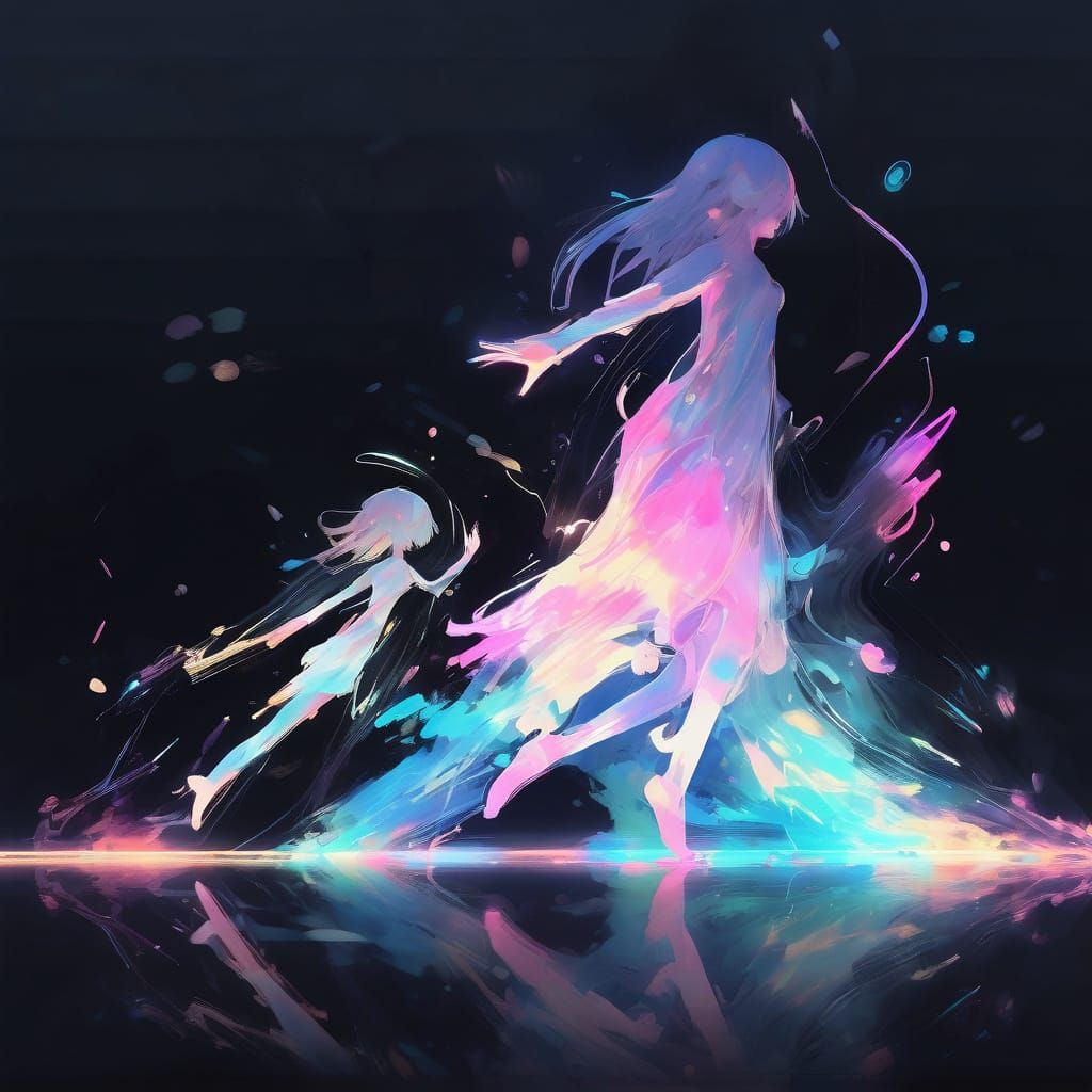 This image depicts an unsettling scene with anime-style elements and horror themes. It features a mix of viscous textures, fragmented transitions, and luminous contrasts, rendered in pastel colors with a smear effect.