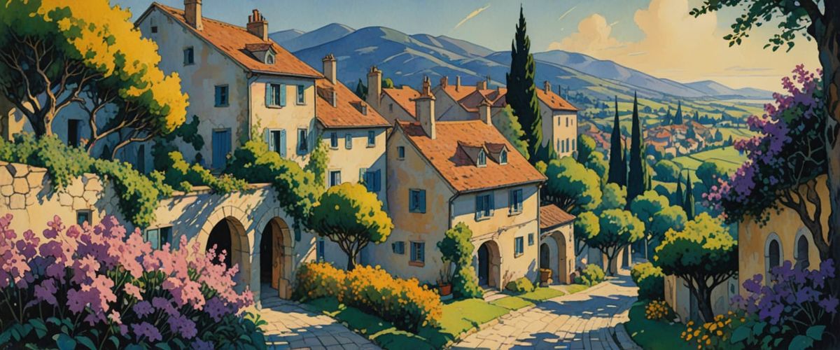 This image shows a vibrant village scene with shops and restaurants under a clear sky. The artwork is dreamlike, rendered in a watercolor and gouache style, with impressionistic influences.
