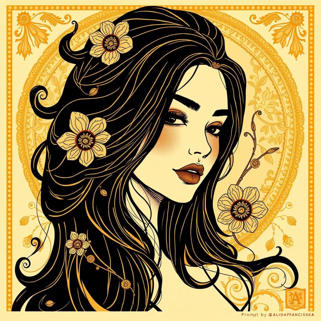 A striking picture of a woman with long flowing black hair highlighted with gold and floral accents. The portrait is rendered in a sophisticated linocut style with rich golden tones.