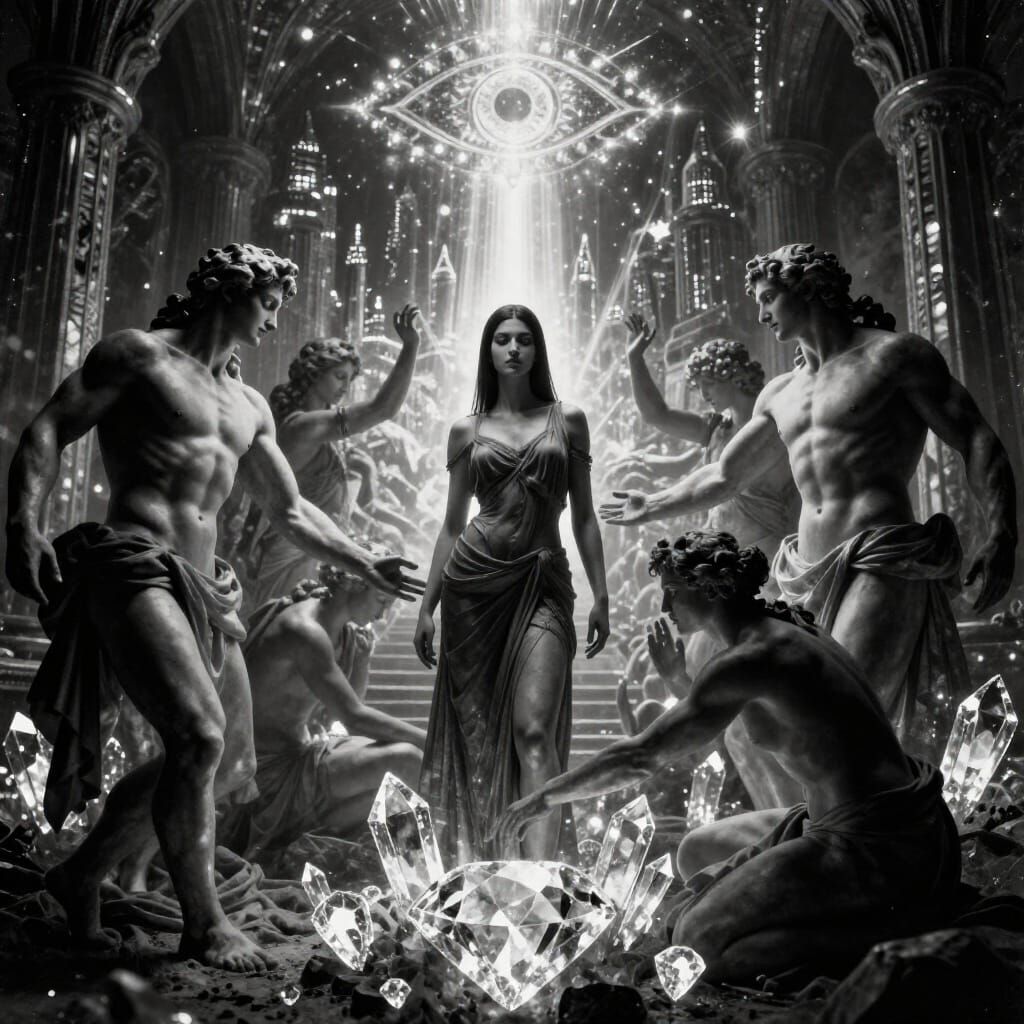 michelangelo paintings guys in glowing crystal diamonds , beautiful armenian woman with ultra straight hair, shy, very connected spiritual, only bicromic, silouette, city of shamballah in background with, third eye chakra,, ray of lights between characters, ultra deep contrast, large scene composition, ...