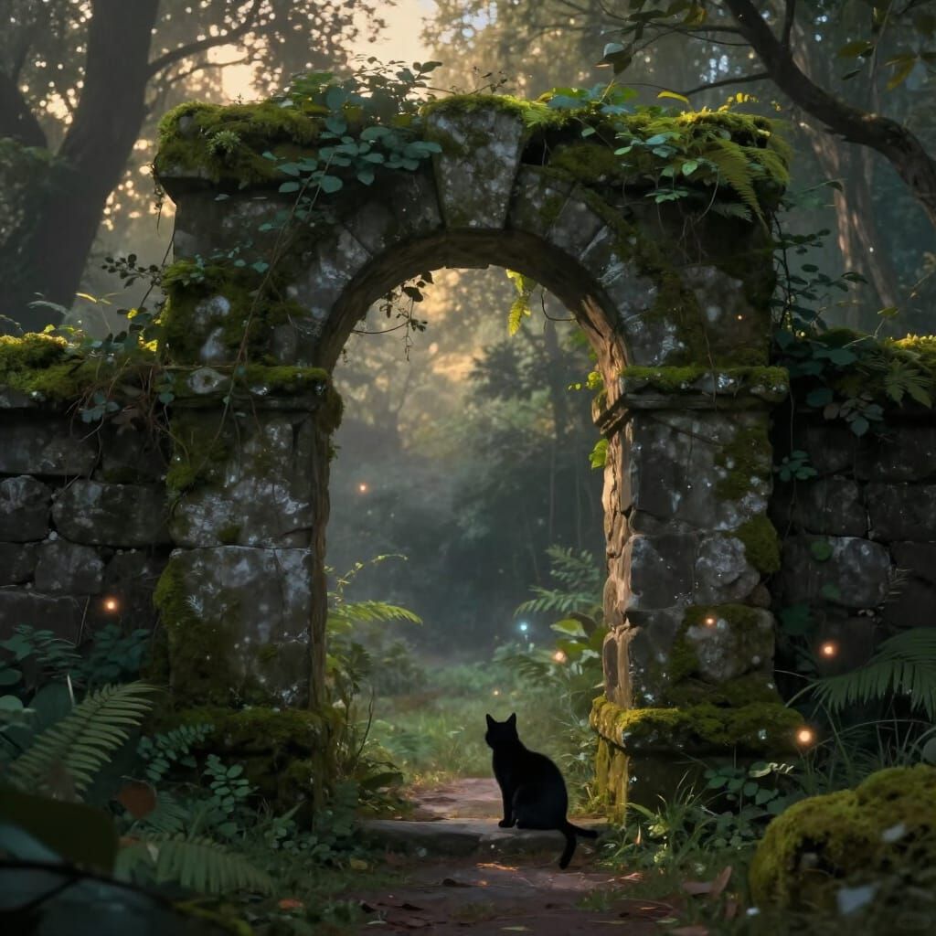 This digital matte painting depicts a mystical, moss-covered archway obscured by foliage, guarded by a black cat. Ethereal orbs and twilight mist create an atmosphere of ancient mystery and hidden realms.