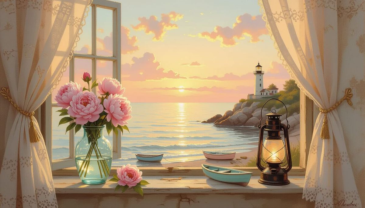 A serene seascape at sunset is captured in this shabby chic painting. An open window frames the tranquil sea view, with light curtains and pastel colors creating a dreamy, romantic atmosphere.
