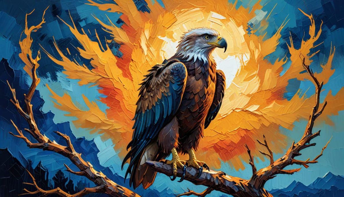 a majestic eagle perched on a weathered twisted branch, looking directly at the viewer. Thick layers of colourful textured paint. Vibrant colours blended in bold brushstrokes. heavy brushstrokes. Dynamic splatter and bold color palette. Dark, muted background with hints of blue and green. Warm golden ...