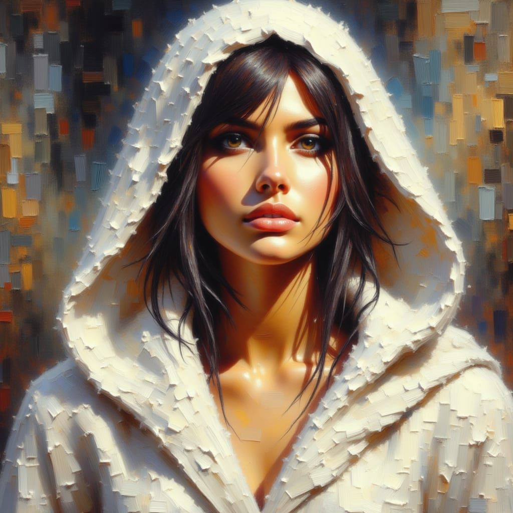 This image shows a portrait of Princess Leia wearing her iconic white hooded robe. The artwork is rendered with an oil and grunge aesthetic, giving it a textured and classic feel.