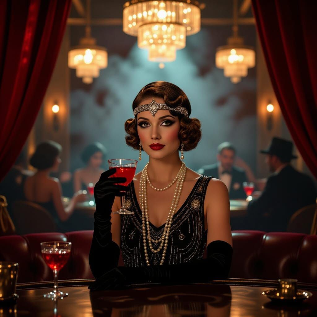 A captivating image shows a flapper-era woman at a bar. The scene blends 1920s style with ancient Babylonian elements, featuring art deco lighting, velvet, and a smoky atmosphere in a cinematic style.