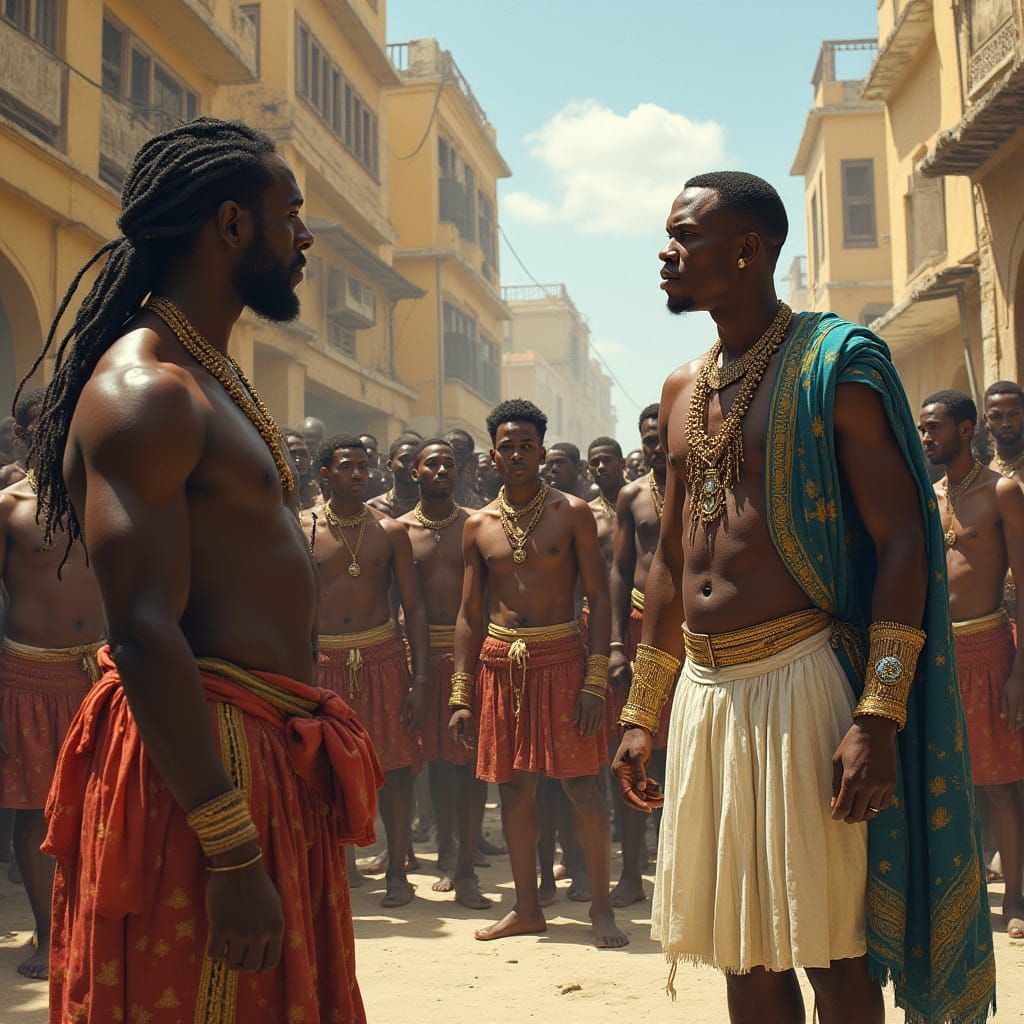 This image depicts an ancient Egyptian official, surrounded by soldiers, reading a decree to a gathered crowd. The official wears a white tunic with golden accents, while the soldiers are clad in white kilts with leather shields and spears. The people, dressed in simple kilts, listen intently as the offi...