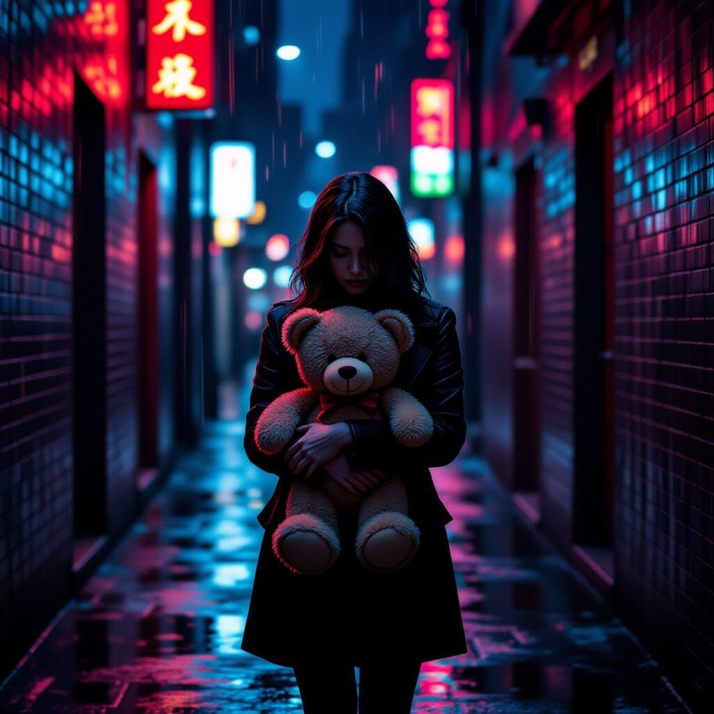 A solitary figure clutches a teddy bear in a dark, wet alley. Neon lights create painterly reflections, evoking a cinematic, noir atmosphere of mystery and foreboding.
