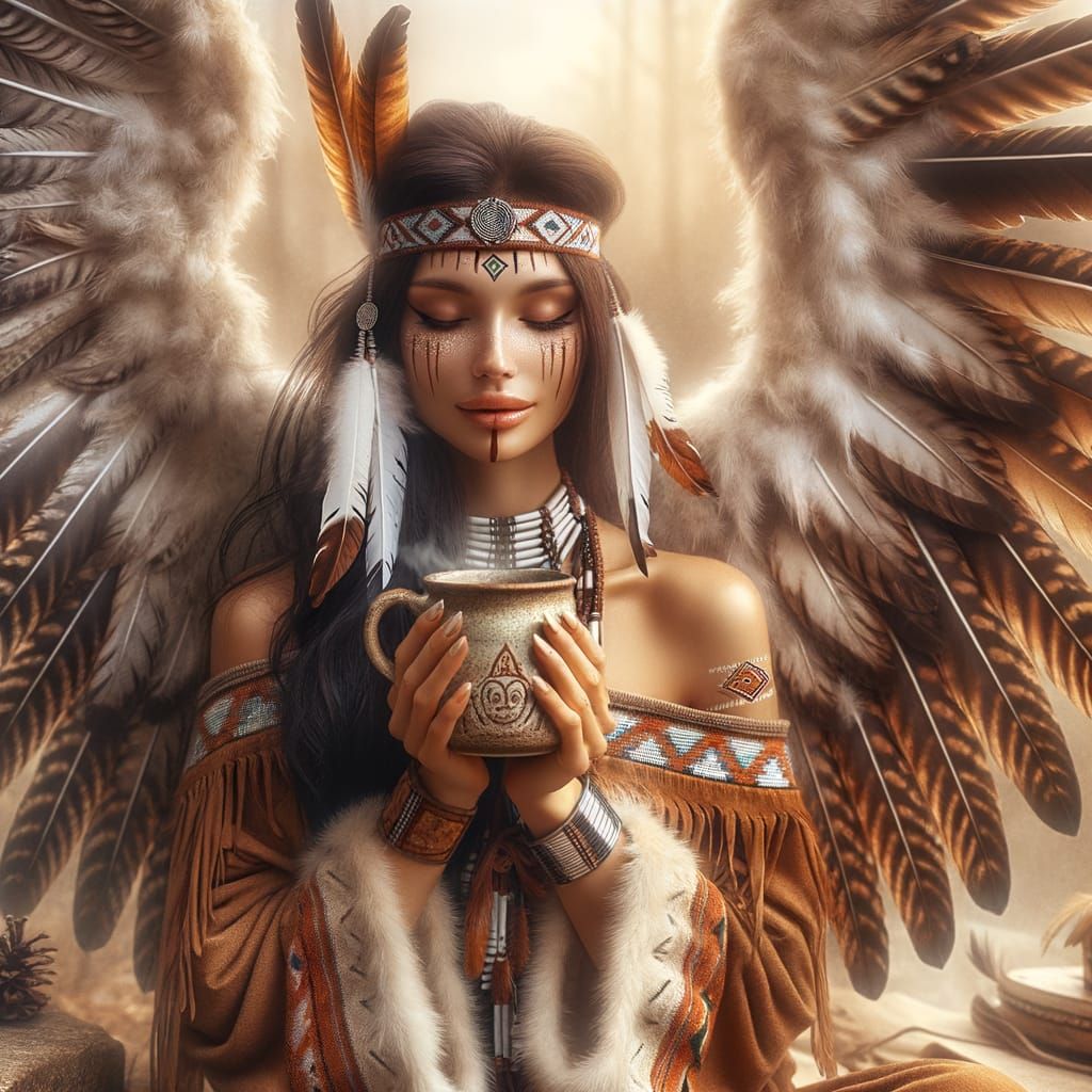 This image shows a Native American angel enjoying a quiet moment drinking coffee. She has feathered wings and tribal features. The scene is rendered in warm, earthy tones.