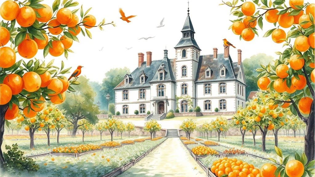 A serene watercolor painting of a chateau surrounded by lush orange orchards, with warm sunlight and vibrant colors, capturing a sense of happiness and tranquility.