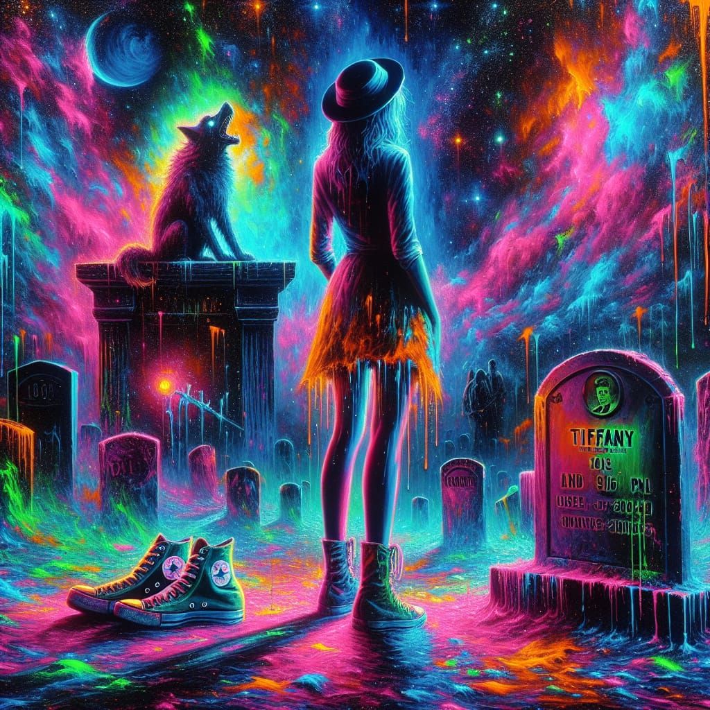 A vivid image of a woman in Converse shoes at a cemetery near a gravestone marked 'Bad Wolf'. Eerie neon colors illuminate the scene in an expressionist style, reminiscent of early 20th-century art, with cinematic lighting.