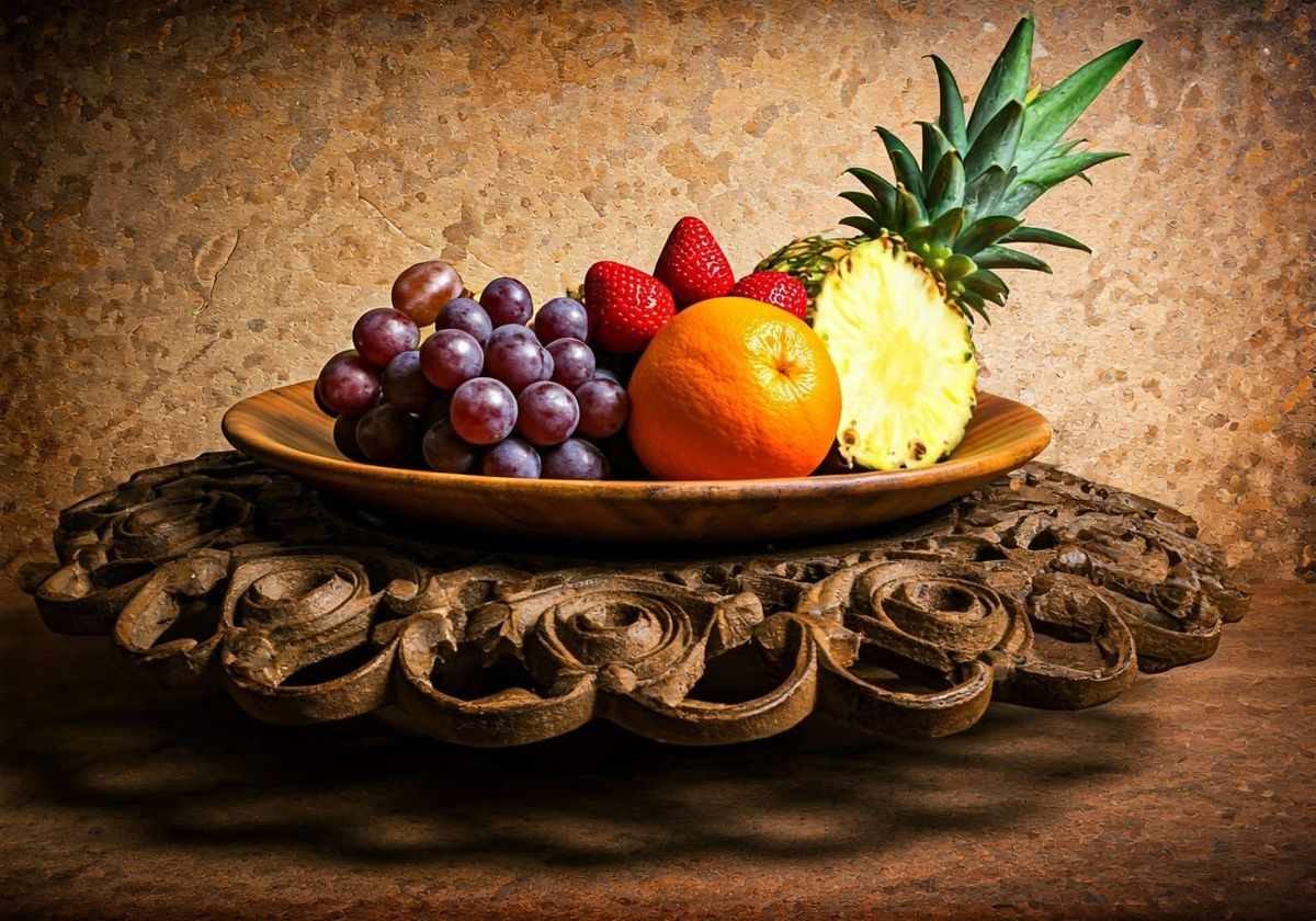 A vibrant display of grapes, strawberries, and pineapple arranged on an ornate wooden plate. The image evokes a pop art feel with photorealistic detail and surreal undertones.
