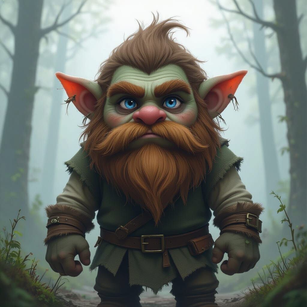 A striking image of a handsome troll standing in a misty forest. The troll has blue eyes, a brown beard, and is dressed in earthy clothing, rendered with vibrant colors and detailed textures in a mystical realism art style.
