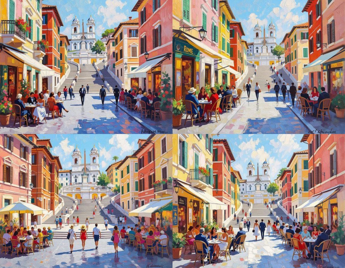 A vibrant street scene in Rome featuring the Spanish Steps. Rendered with thick brushstrokes and textured layers, the image captures the bustling atmosphere with people enjoying cafes and the view.