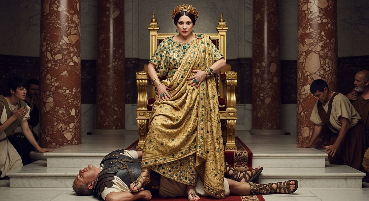 This image shows a Roman Empress in a lavish throne room, stepping on a defeated senator as peasants beg. The photograph, reminiscent of Crewdson, Sherman, and Leibovitz, features sharp focus and bokeh.