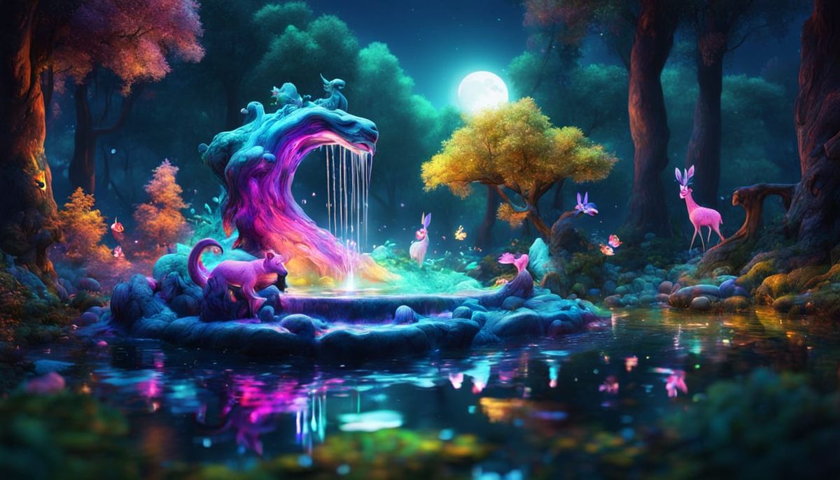 A striking picture of a whimsical animal fountain in a moonlit courtyard, spilling glowing liquid paint. This enchanting fantasy landscape features shimmering water reflections and vibrant colors in a magical realism style.