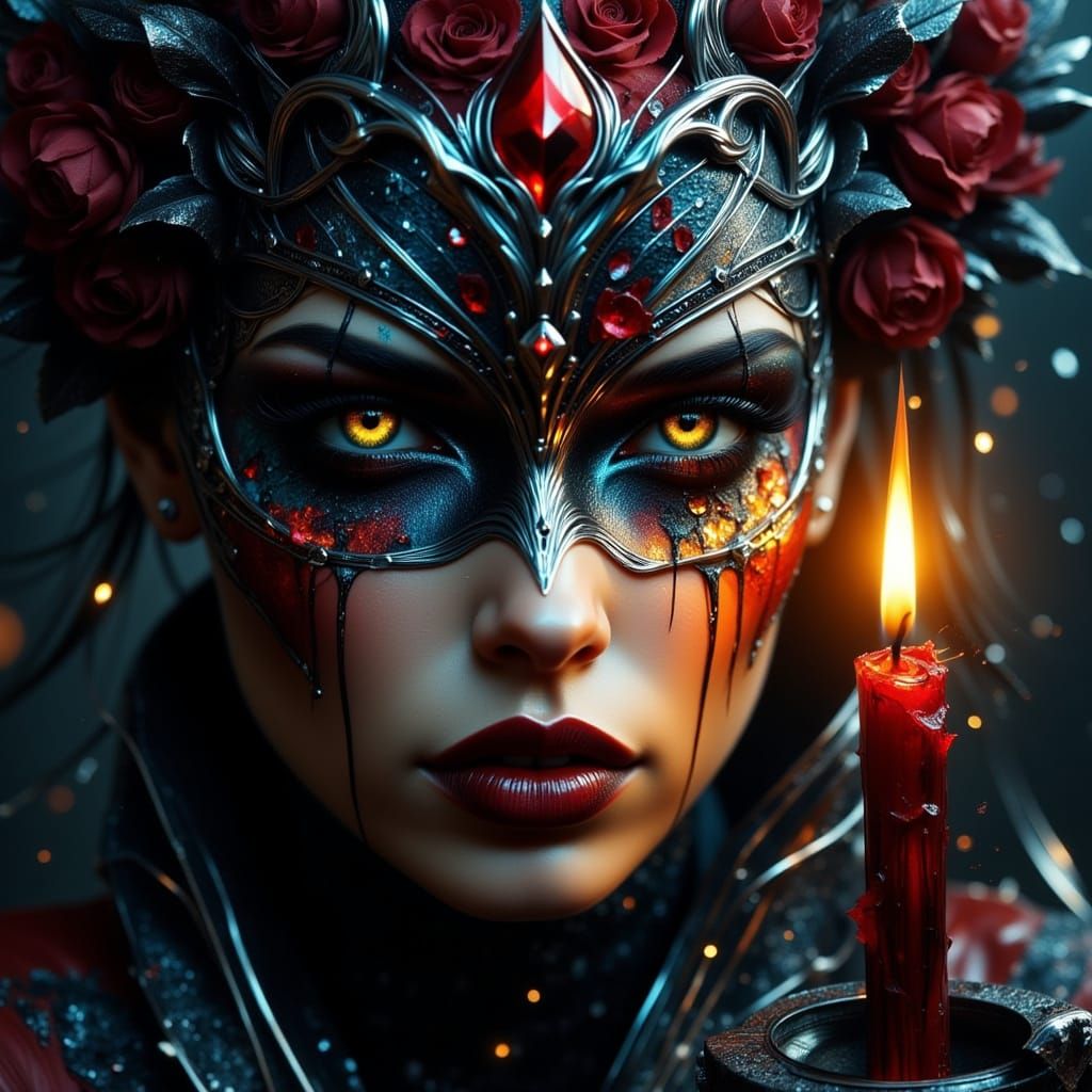 This image shows a hyperrealistic portrait of a goth woman with makeup and black tears, illuminated by a red candle. The artwork features dynamic lighting and intricate details in a dark, triadic color scheme.