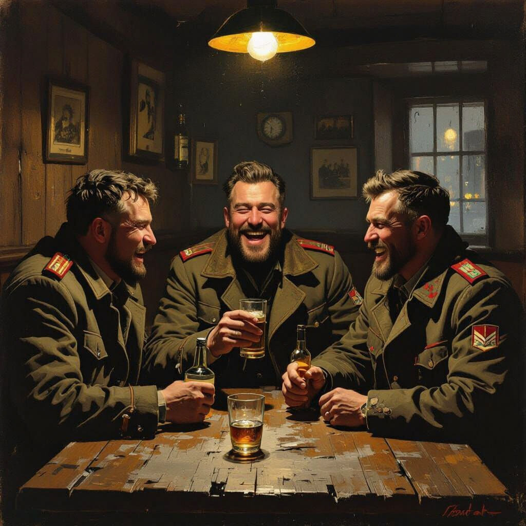 A dimly lit tavern scene of a Russian Cold War soldier drinking vodka with his three brothers. The image evokes bold brushstrokes and muted earthy tones, with a cinematic, digital art style.