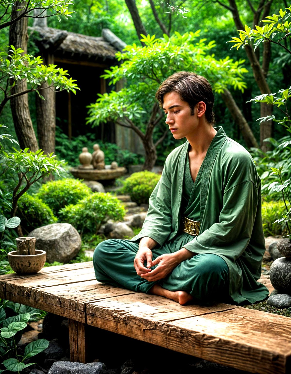This hyper-realistic image shows a man meditating on a rustic bench in a magical, floating Zen garden. The artwork features a maximalist aesthetic with intricate details and soft lighting.