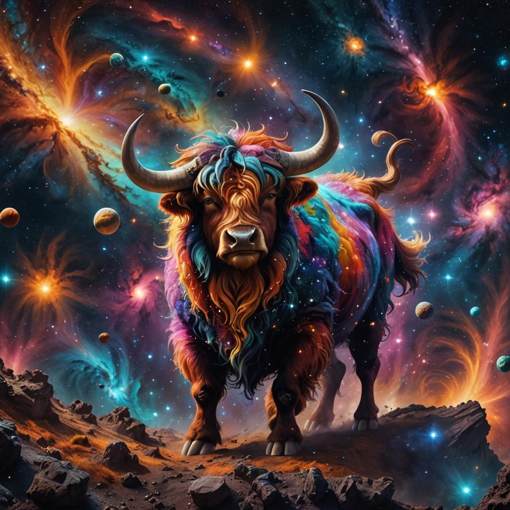 A hyperrealistic image of a brightly colored, furry ox floating in space among swirling galaxies and stars. The image is a detailed matte painting with cinematic lighting and particle effects.