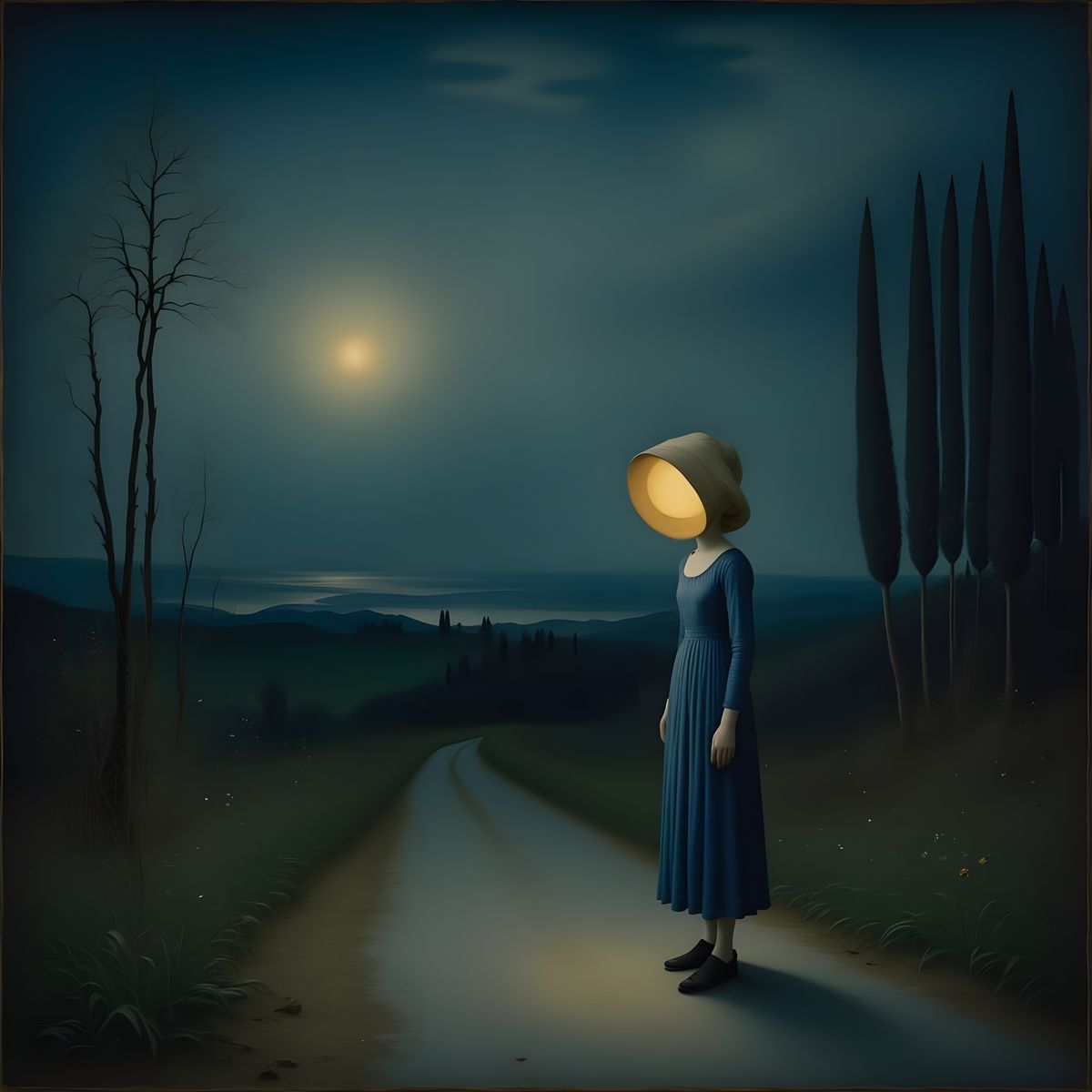 <lora:Medieval Spirit Flux:1.0> Surrealism. A woman's head is a lantern. She stands on a roadside on a dim night. She has a non-human posture. Her feet are tiny. The iridescent glimmering light from her lamp-head illuminates a quiet highway. Strange attractors. medieval