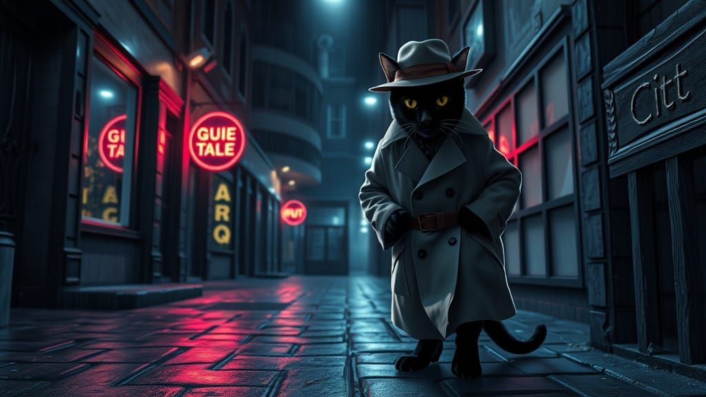 A dramatic image shows a black cat dressed as a detective in a dark alley. The scene is cinematic, with neon lights and rain creating a noir atmosphere with deep blues and blacks.