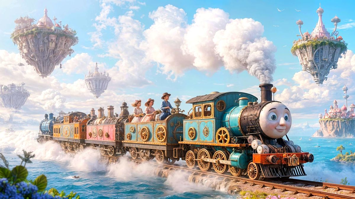 This image depicts a magical train with intricate gears and steam pipes traveling through a surreal ocean-sky. Features ethereal passengers, floating islands, and a pastel color palette with soft, dreamlike lighting.