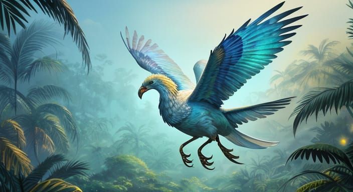 This image shows a griffin flying over an alien jungle. The scene is rendered with soft lighting and delicate brushstrokes, creating a dreamy, fantasy atmosphere with pastel hues.